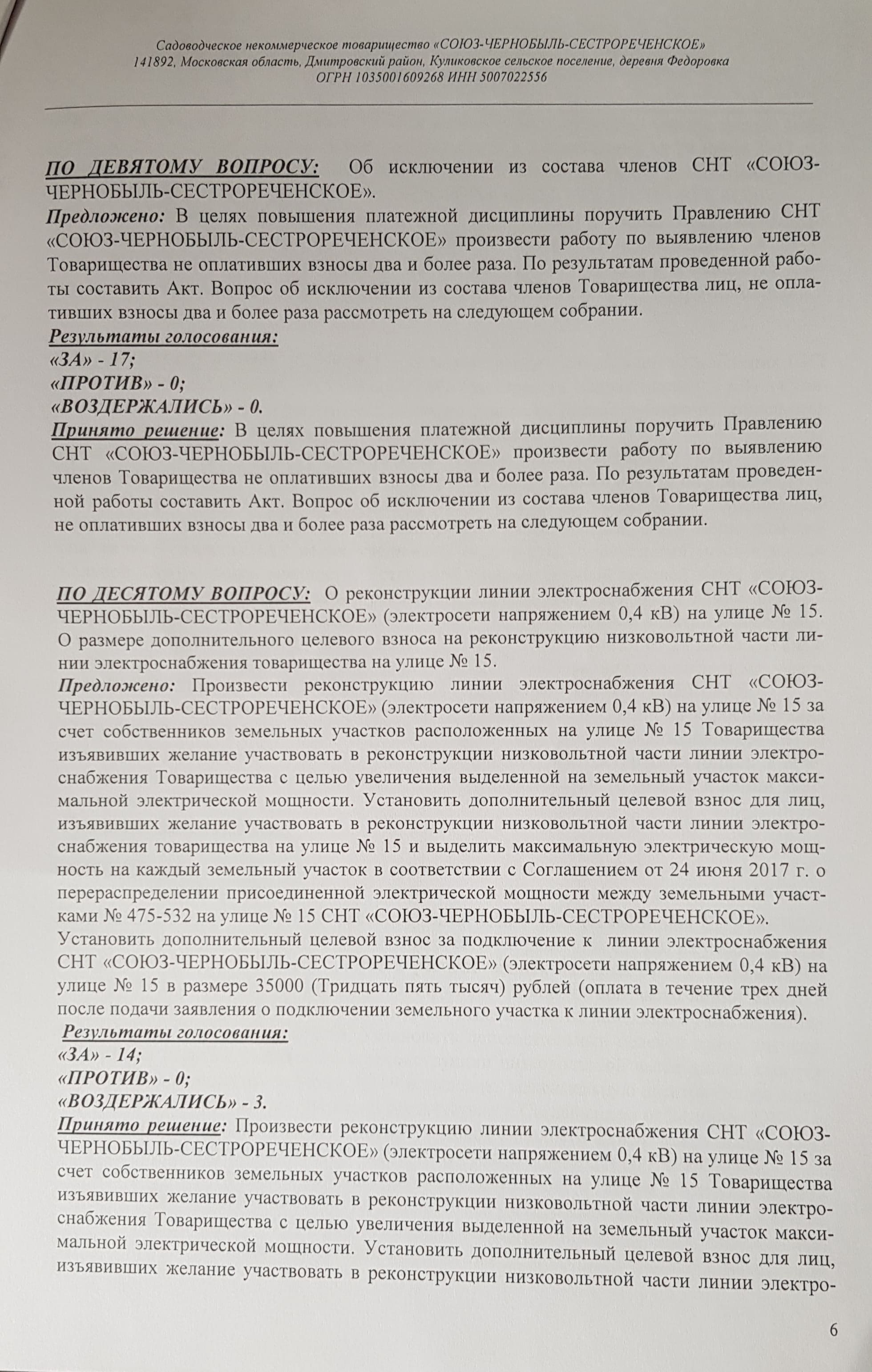 Протокол № 15 собрания уполномоченных членов СНТ "СОЮЗ-ЧЕРНОБЫЛЬ-СЕСТРОРЕЧЕНСКОЕ" от 30.06.2018 г.: