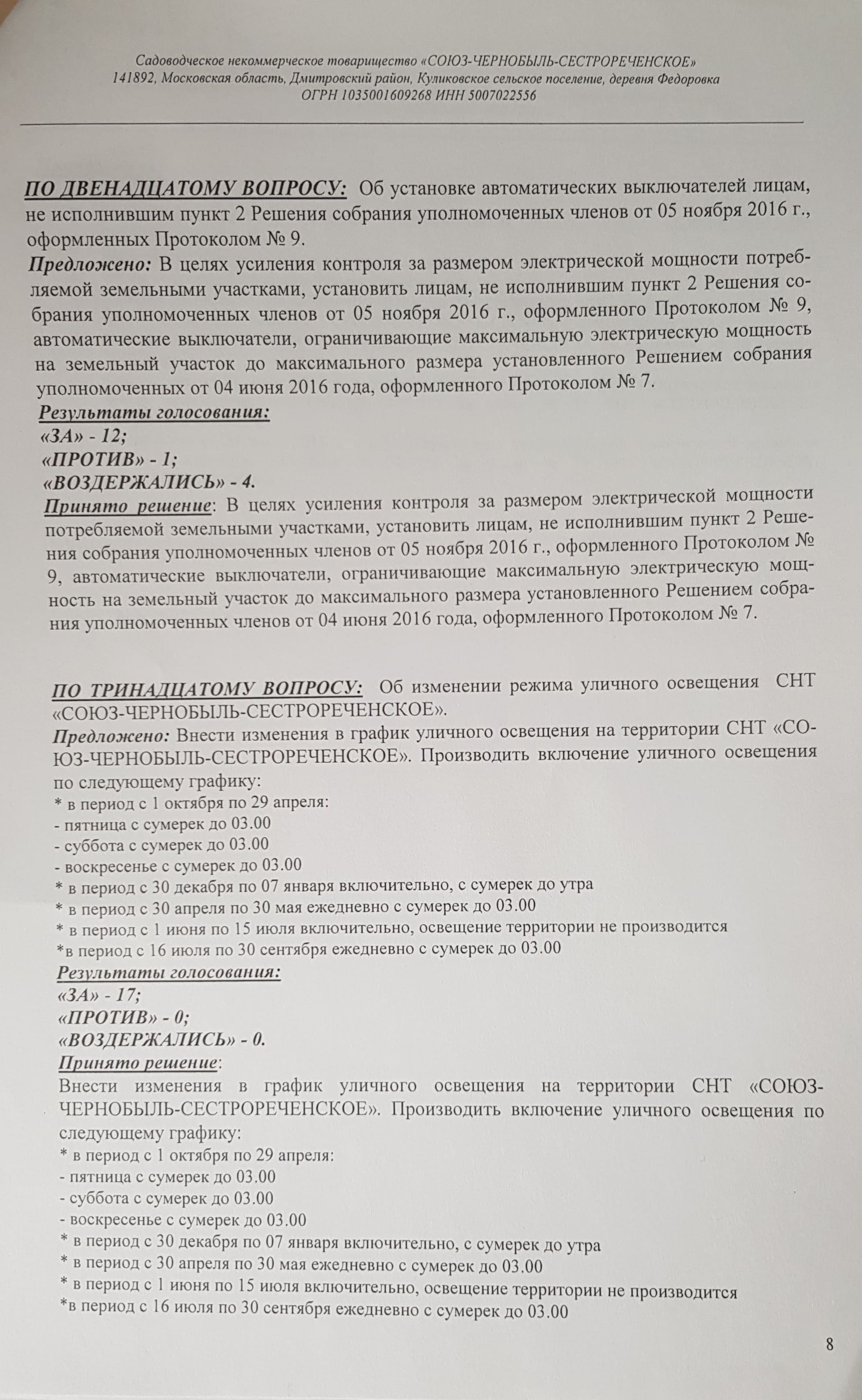 Протокол № 16 собрания уполномоченных членов СНТ "СОЮЗ-ЧЕРНОБЫЛЬ-СЕСТРОРЕЧЕНСКОЕ" от 18.08.2018 г.: