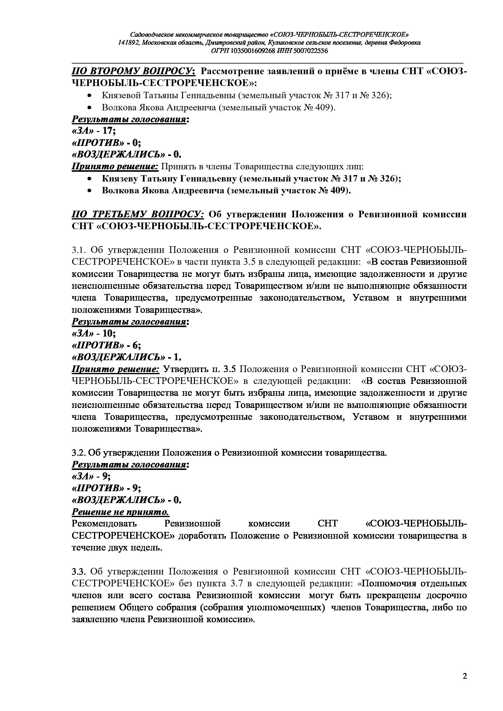 Протокол № 2 внеочередного общего собрания членов СНТ "СОЮЗ-ЧЕРНОБЫЛЬ-СЕСТРОРЕЧЕНСКОЕ" от 01 октября 2022 г.:
