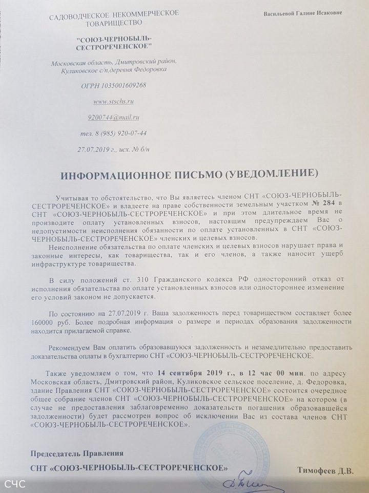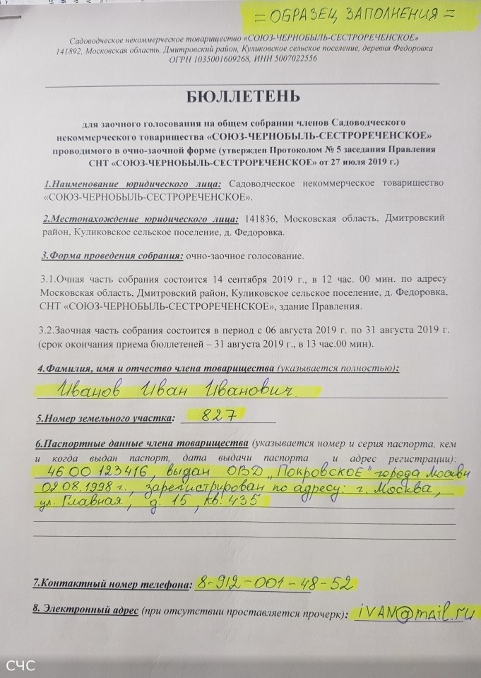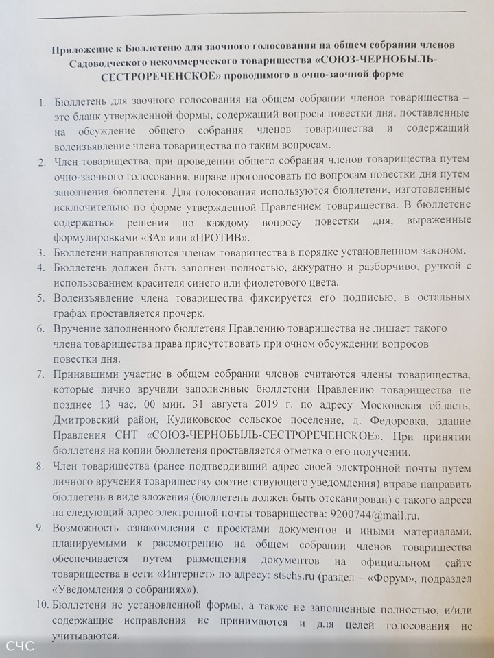 Уважаемые члены товарищества! Вы можете участвовать в принятии решения по вопросам повестки дня собрания не только путем очного обсуждения вопросов, но и путем вручения Правлению товарищества бюллетеня для заочного голосования, в порядке предусмотренном Протоколом заседания Правления СНТ "СОЮЗ-ЧЕРНОБЫЛЬ-СЕСТРОРЕЧЕНСКОЕ" номер 5 от 27 июля 2019 г.