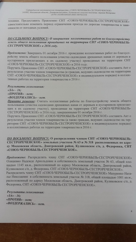 Протокол № 7 собрания уполномоченных членов СНТ "СОЮЗ-ЧЕРНОБЫЛЬ-СЕСТРОРЕЧЕНСКОЕ" от 04.06.2016 г.