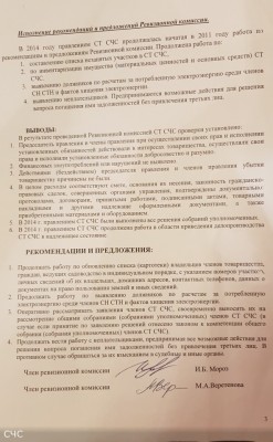 Описание: Проверка финансово-хозяйственной деятельности производилась Ревизионной комиссией товарищества в составе: Мороз И.Б., Веретенова М.А. Ревизия не выявила финансовых злоупотреблений или нарушений. Заключение Ревизионной комиссии утверждено Протоколом № 4 общего собрания (собрания уполномоченных) членов СНТ "СОЮЗ-ЧЕРНОБЫЛЬ-СЕСТРОРЕЧЕНСКОЕ" от 03.10.2015 г.