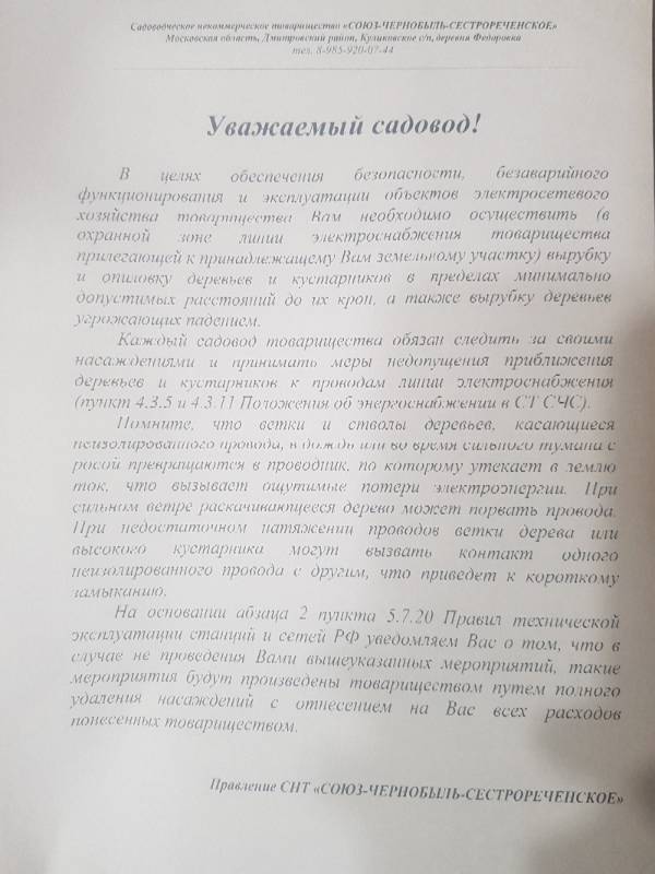 Ответ садовода на предписание о необходимости удаления деревьев по ЛЭП