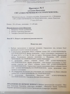 Протокол № 5 заседания Правления СНТ "СОЮЗ-ЧЕРНОБЫЛЬ-СЕСТРОРЕЧЕНСКОЕ" от 06 июня 2019 г.: