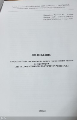 С Положением о порядке въезда, движения и парковки транспортных средств на территрории СНТ "СОЮЗ-ЧЕРНОБЫЛЬ-СЕСТРОРЕЧЕНСКОЕ" Вы можете также ознакомиться на сайте товарищества в разделе "Регламентирующие документы"
