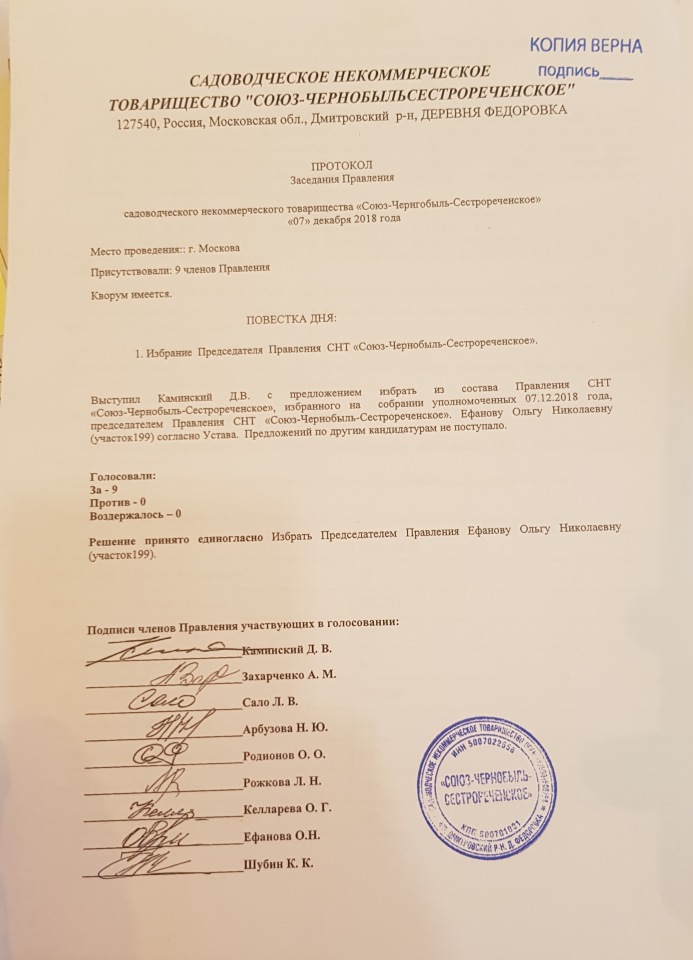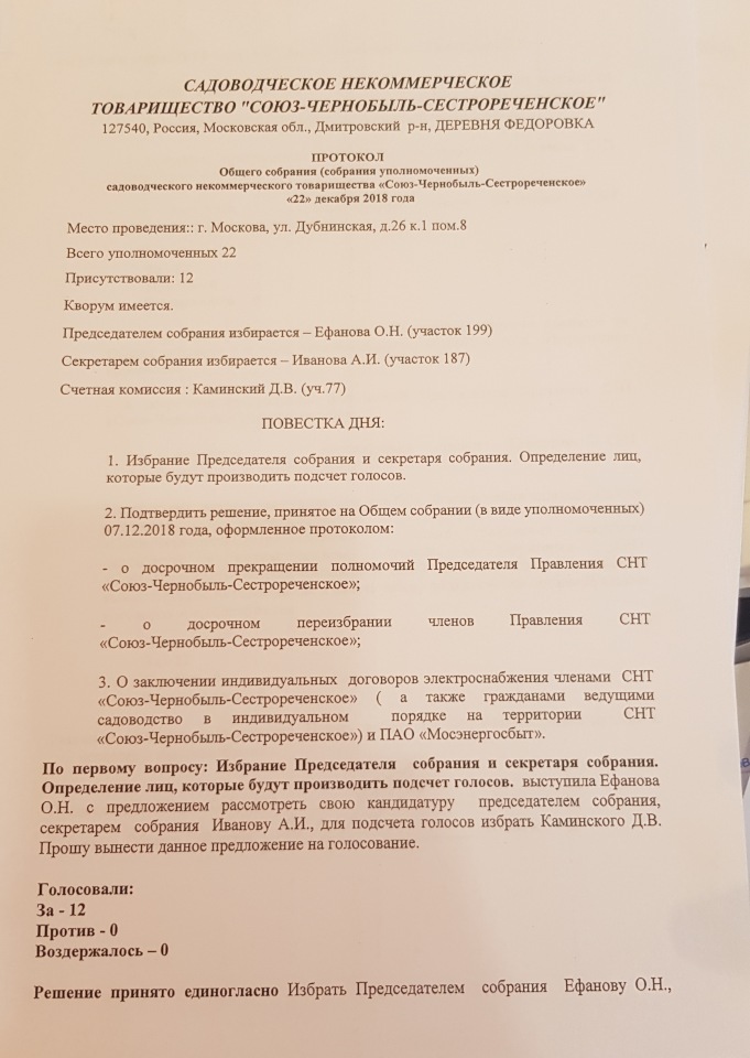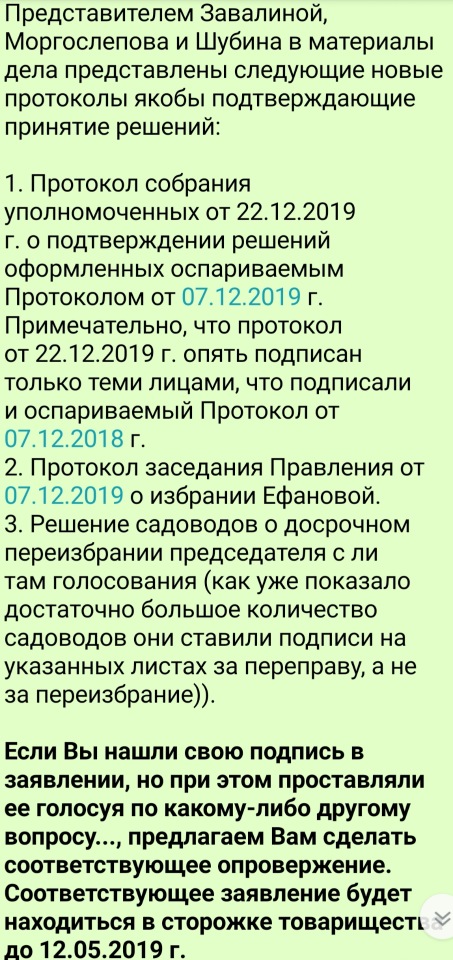 Гражданином Моргослеповым представлен в суд: ]Протокол заседания лжеправления о якобы повторном избрании гражданки Ефановой). Ранее утверждалось, что она была избрана 07.12.2018 г. собранием уполномоченных. Протокол стыдливо заверен лжепечатью товарищеста):