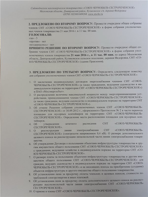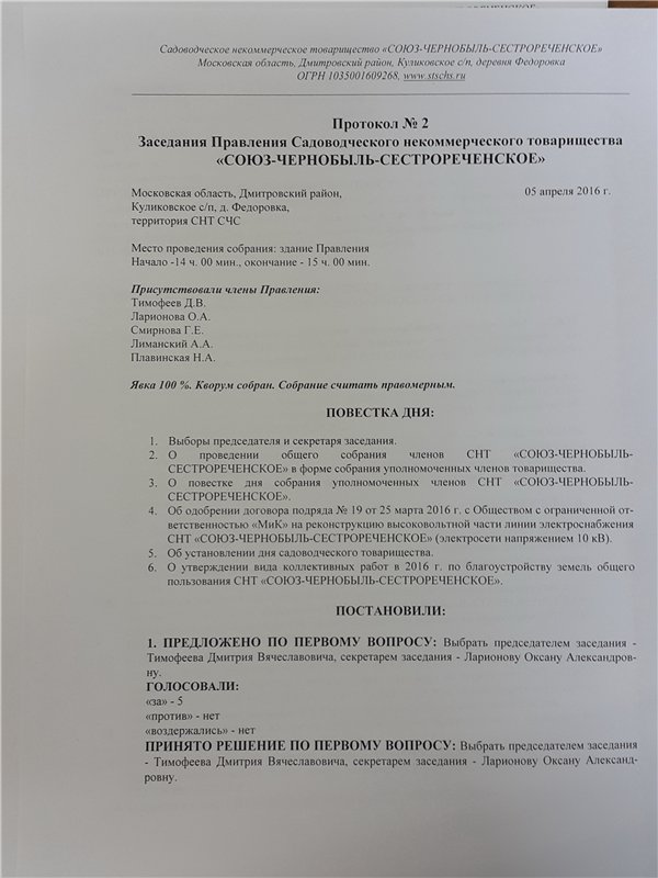 Протокол № 2 заседания Правления СНТ "СОЮЗ-ЧЕРНОБЫЛЬ-СЕСТРОРЕЧЕНСКОЕ" от 05 апреля 2016 г. (дата размещения: 11 апреля 2016 г.)