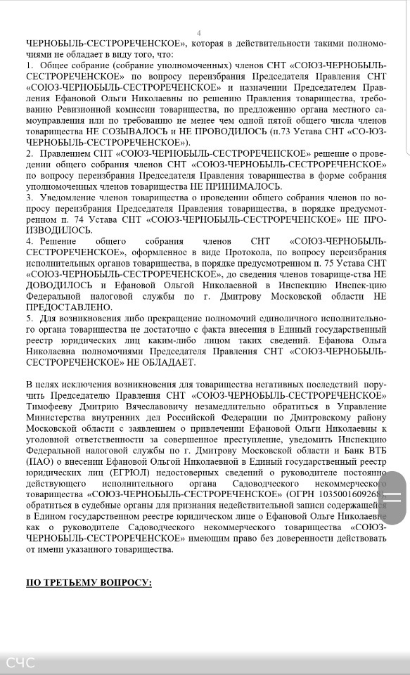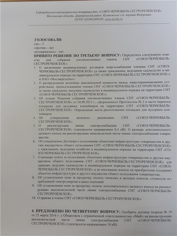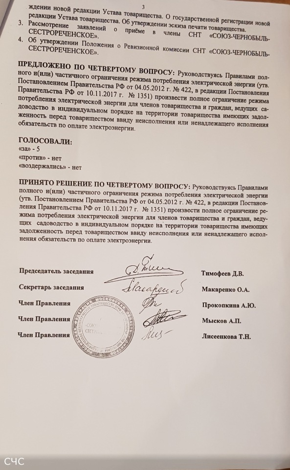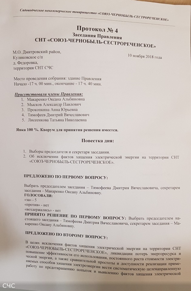 Протокол № 4 заседания Правления СНТ "СОЮЗ-ЧЕРНОБЫЛЬ-СЕСТРОРЕЧЕНСКОЕ" от 10 ноября 2018 г.: