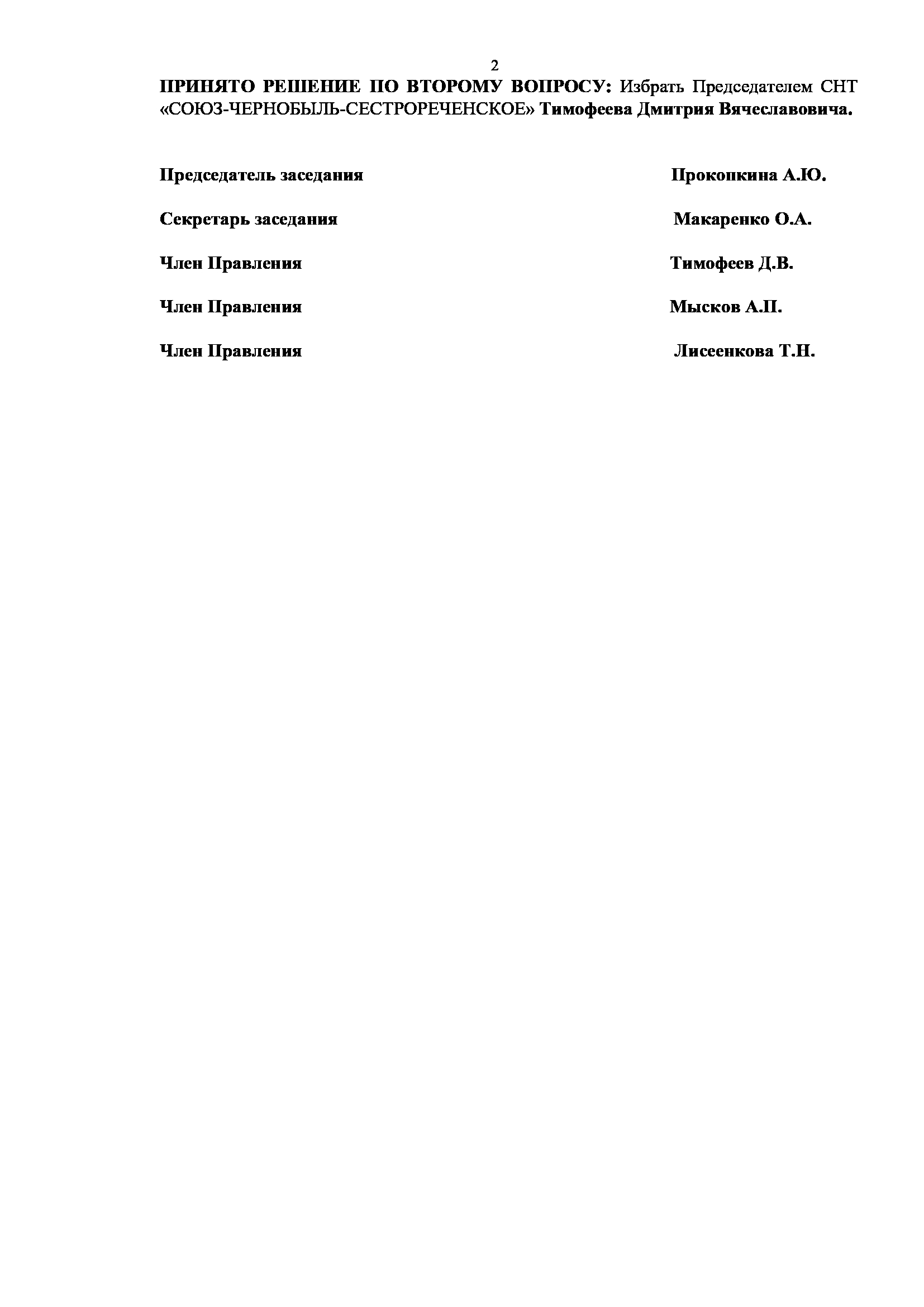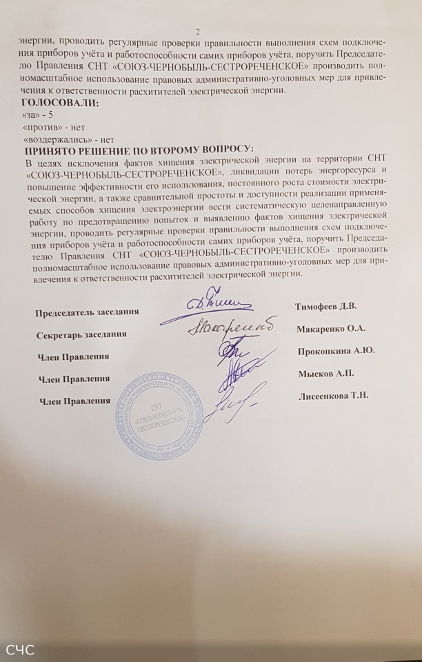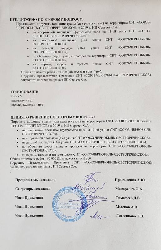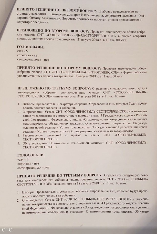 Протокол № 2 заседания Правления СНТ "СОЮЗ-ЧЕРНОБЫЛЬ-СЕСТРОРЕЧЕНСКОЕ" от 15.06.2018 г.