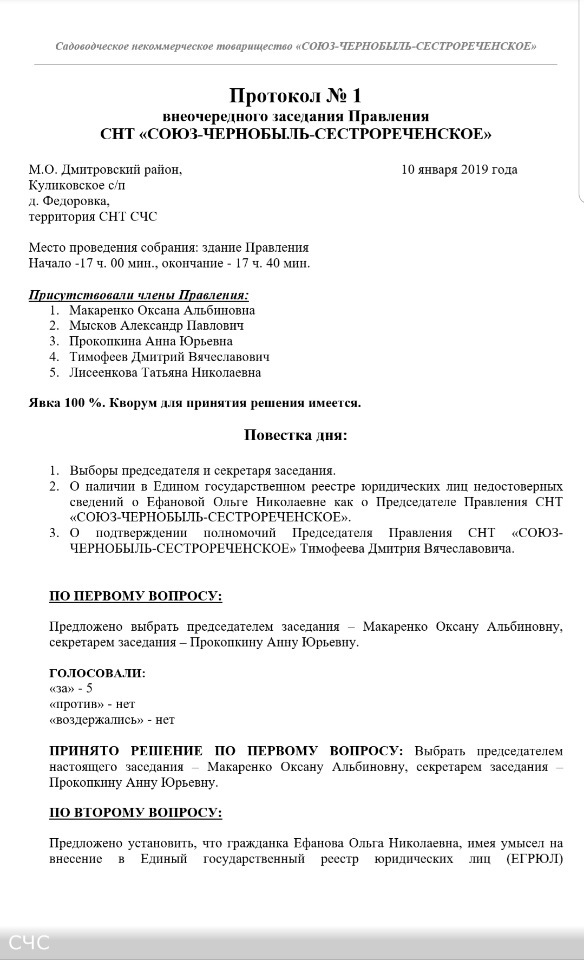 Протокол № 1 внеочередного заседания Правления СНТ "СОЮЗ-ЧЕРНОБЫЛЬ-СЕСТРОРЕЧЕНСКОЕ" от 10 января 2019 г.: