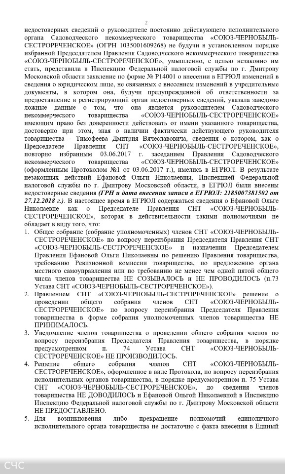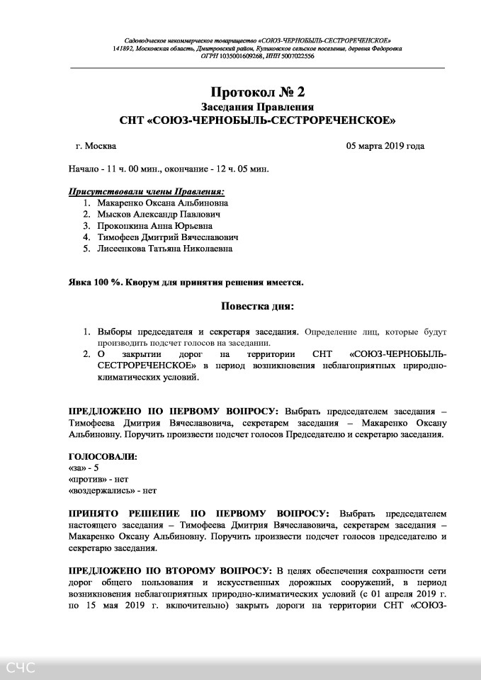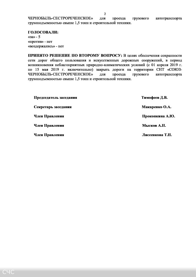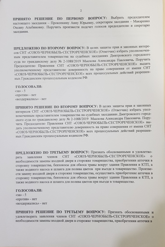 Протокол № 2 заседания Правления СНТ "СОЮЗ-ЧЕРНОБЫЛЬ-СЕСТРОРЕЧЕНСКОЕ" от 05.03.2019 г.