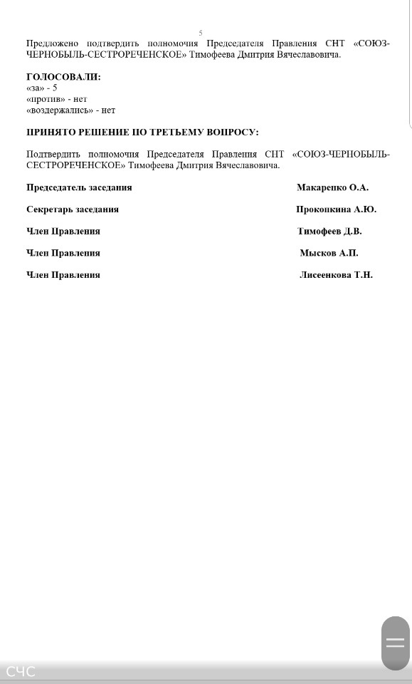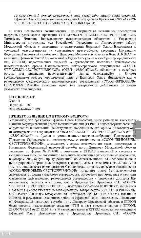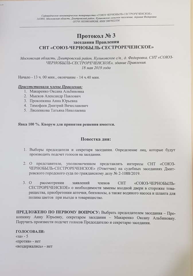 Протокол № 3 заседания Правления СНТ "СОЮЗ-ЧЕРНОБЫЛЬ-СЕСТРОРЕЧЕНСКОЕ" от 18.05.2019 г.