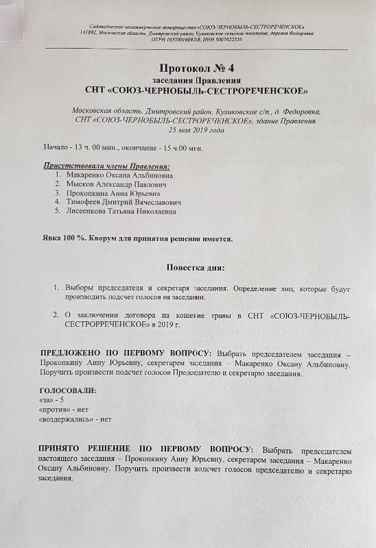 Протокол заседания Правления СНТ "СОЮЗ-ЧЕРНОБЫЛЬ-СЕСТРОРЕЧЕНСКОЕ" от 25 мая 2019 г.: