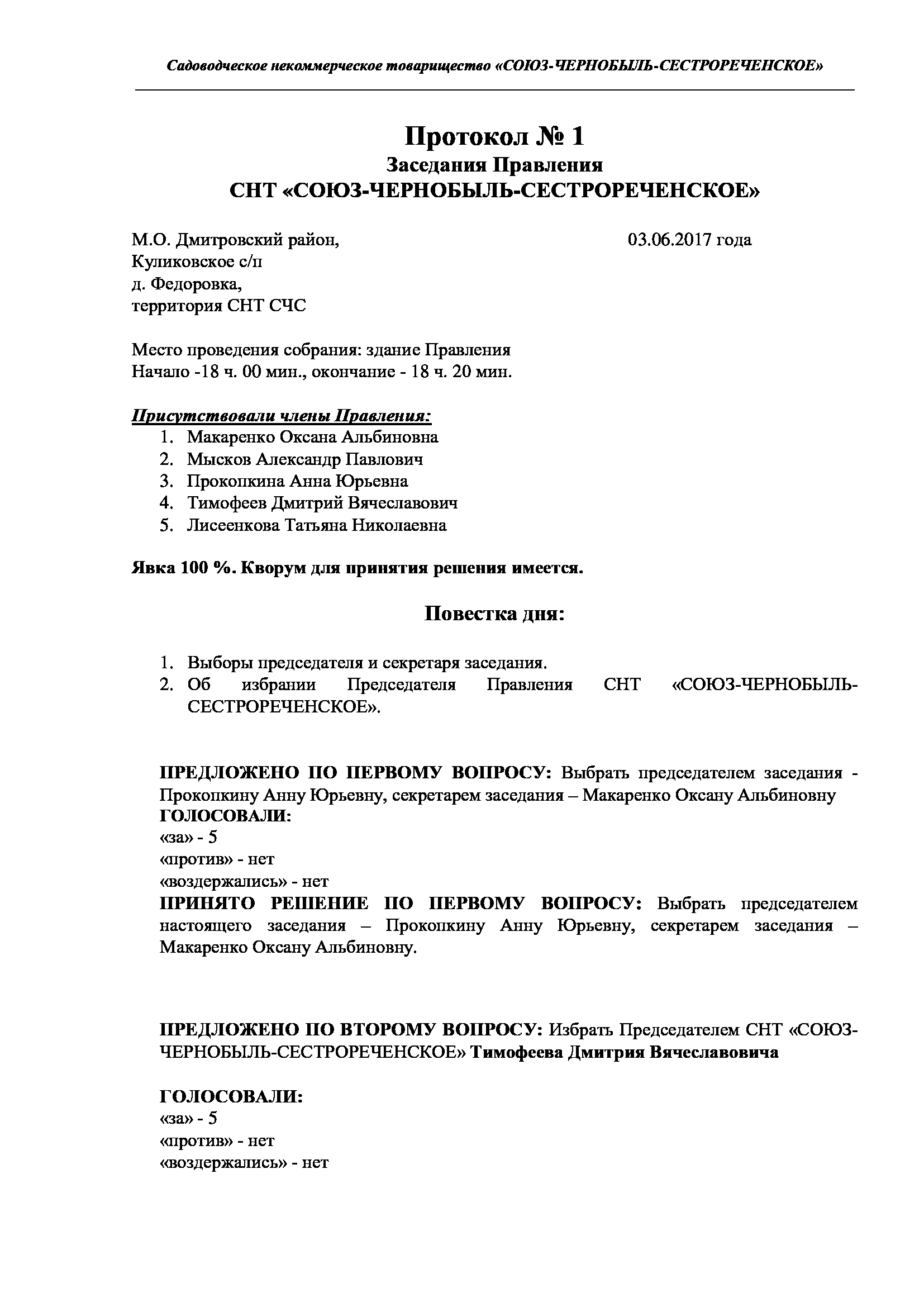 Протокол № 1 заседания Правления СНТ "СОЮЗ-ЧЕРНОБЫЛЬ-СЕСТРОРЕЧЕНСКОЕ": от 03.06.2017 г.