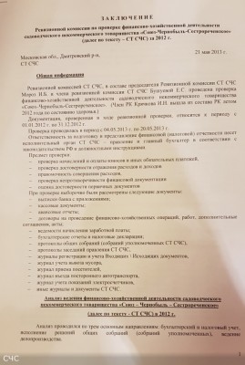 Описание: Проверка финансово-хозяйственной деятельности производилась Ревизионной комиссией товарищества в составе: Мороз И.Б. (Председатель Ревизионной комиссии), Бушуева Е.С. (член Ревизионной комиссии). Ревизия не выявила финансовых злоупотреблений или нарушений. Заключение Ревизионной комиссии утверждено Протоколом № 1 общего собрания (собрания уполномоченных) членов СНТ "СОЮЗ-ЧЕРНОБЫЛЬ-СЕСТРОРЕЧЕНСКОЕ" от 26.05.2013 г.).