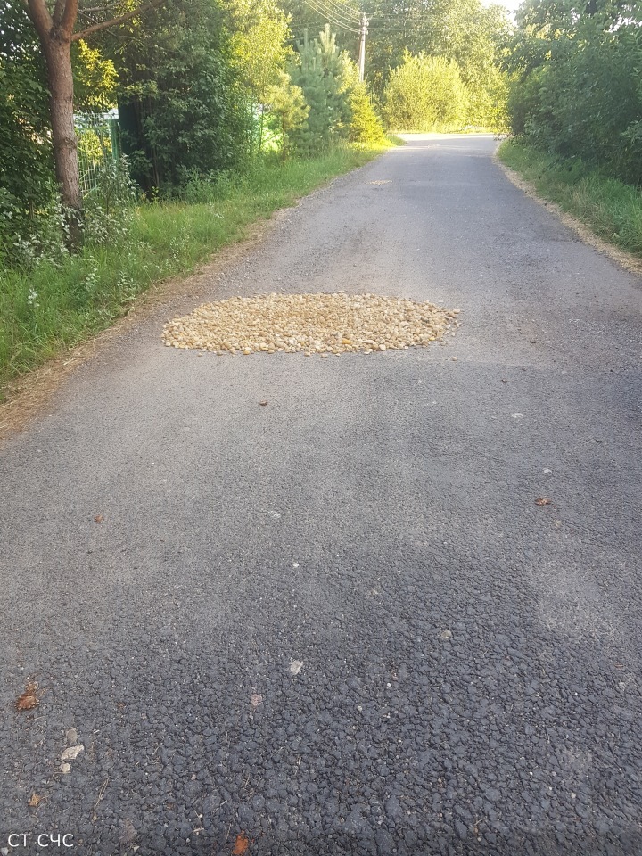 Произведена засыпка гравием провала под дорогой на въезде в товарищество :
