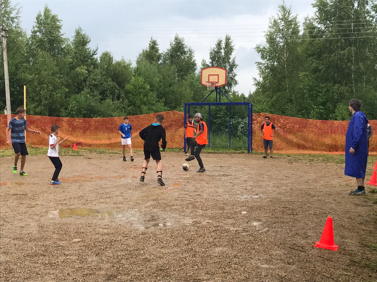 Площадку подготовили за день - натянули сигнальное ограждение, которое было призвано спасти мяч от улетания в пруд и канаву; натянули тенты от дождя. В день мероприятия заехали заранее, установили звуковое оборудование, разогнали лужи.
