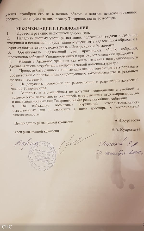 Описание: Проверка производилась в период с 22.03.2009 г. по 26.04.2009 г. Ревизионной комиссией товарищества в составе: Председатель Ревизионной комиссии – Куртасова А.Н., член РК – Кудрявцева Н.А. Выписка из Заключения Ревизионной комиссии никем не подписана, заверена только Председателем Хапаловым Е.А. Самого Заключения, как такового, нет. Проверялось только делопроизводство и ведение документации, проверка финансово-хозяйственной деятельности не проводилась. В Выписке из Заключения указано, что проверка проведена соответствии с Положением о Ревизионной комиссии, однако такое положение никем не утверждалось.