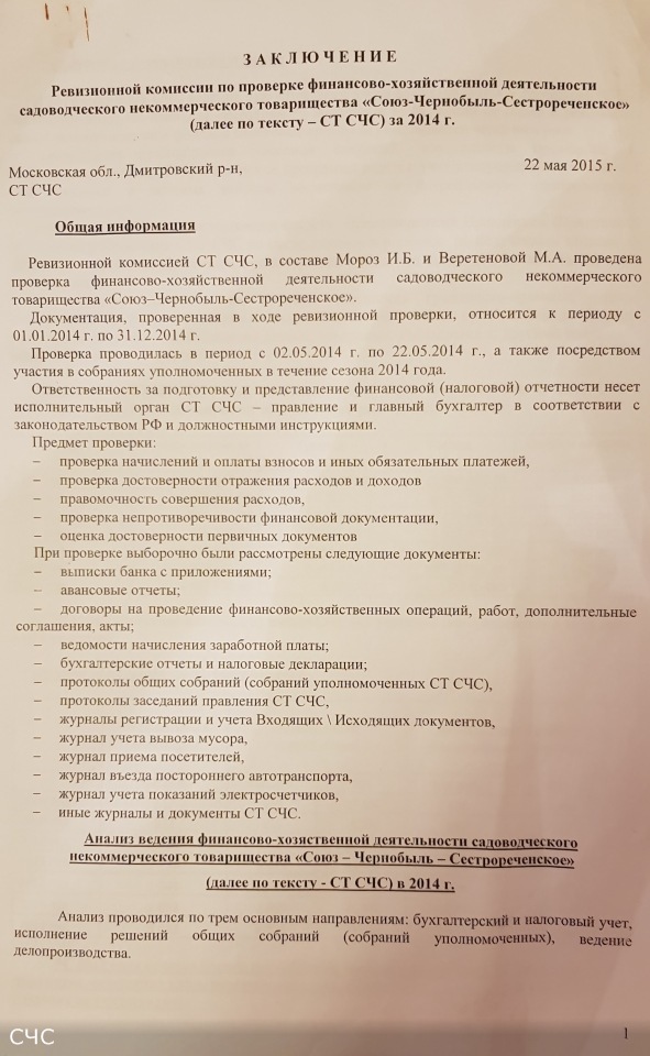 Описание: Проверка финансово-хозяйственной деятельности производилась Ревизионной комиссией товарищества в составе: Мороз И.Б., Веретенова М.А. Ревизия не выявила финансовых злоупотреблений или нарушений. Заключение Ревизионной комиссии утверждено Протоколом № 4 общего собрания (собрания уполномоченных) членов СНТ "СОЮЗ-ЧЕРНОБЫЛЬ-СЕСТРОРЕЧЕНСКОЕ" от 03.10.2015 г.