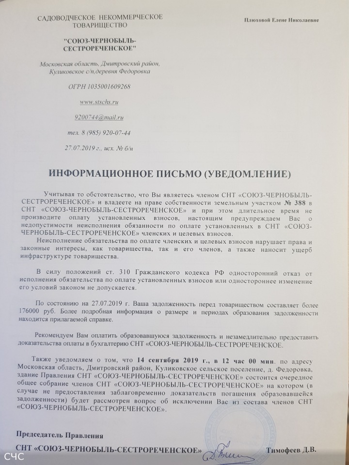 Настоящим информируем Вас, что Общее собрание членов СНТ "СОЮЗ-ЧЕРНОБЫЛЬ-СЕСТРОРЕЧЕНСКОЕ" (форма проведения-очно-заочное голосование, назначенное на 14 сентября 2019 г.) признано Правлением товарищества несостоявшимся в связи с отсутствием кворума предусмотренного п. 19 ст. 17 ФЗ "О ведении гражданами садоводства и огородничества для собственных нужд и о внесении изменений в отдельные законодательные акты Российской Федерации". Решение Правления СНТ "СОЮЗ-ЧЕРНОБЫЛЬ-СЕСТРОРЕЧЕНСКОЕ" о признании указанного Общего собрания членов несостоявшимся оформлено Протоколом № 6 заседания Правления СНТ "СОЮЗ-ЧЕРНОБЫЛЬ-СЕСТРОРЕЧЕНСКОЕ" от 14 сентября 2019 г., которое размещено по ссылке:viewtopic.php?t=1482&start=10