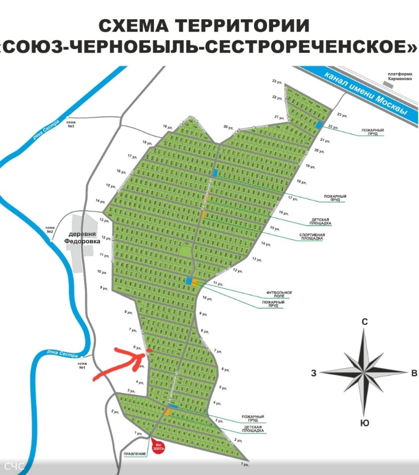 Силами работников товарищества произведено удаление деревьев и кустарников на 6-ой улице, затрудняющих нормальную работу линии электроснабжения товарищества (отмечено на схеме красным цветом):