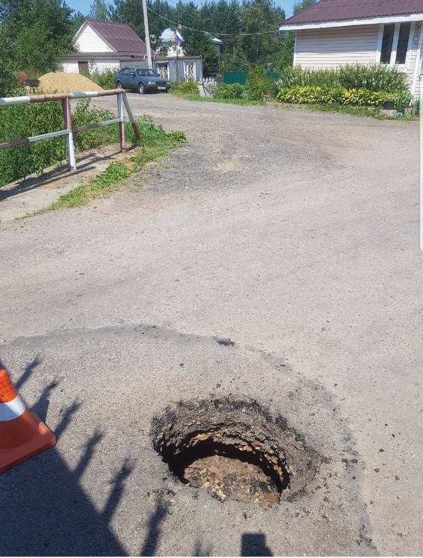 Произведена засыпка гравием провала под дорогой на въезде в товарищество :