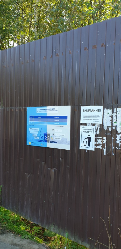 На мусорной площадке установлена табличка "График вывоза отходов" (Постановление Правительства Московской области от 18 декабря 2018 г. N 970/45):