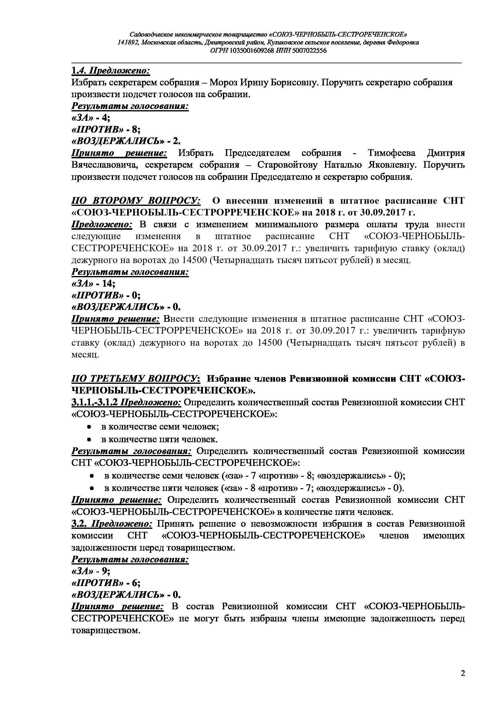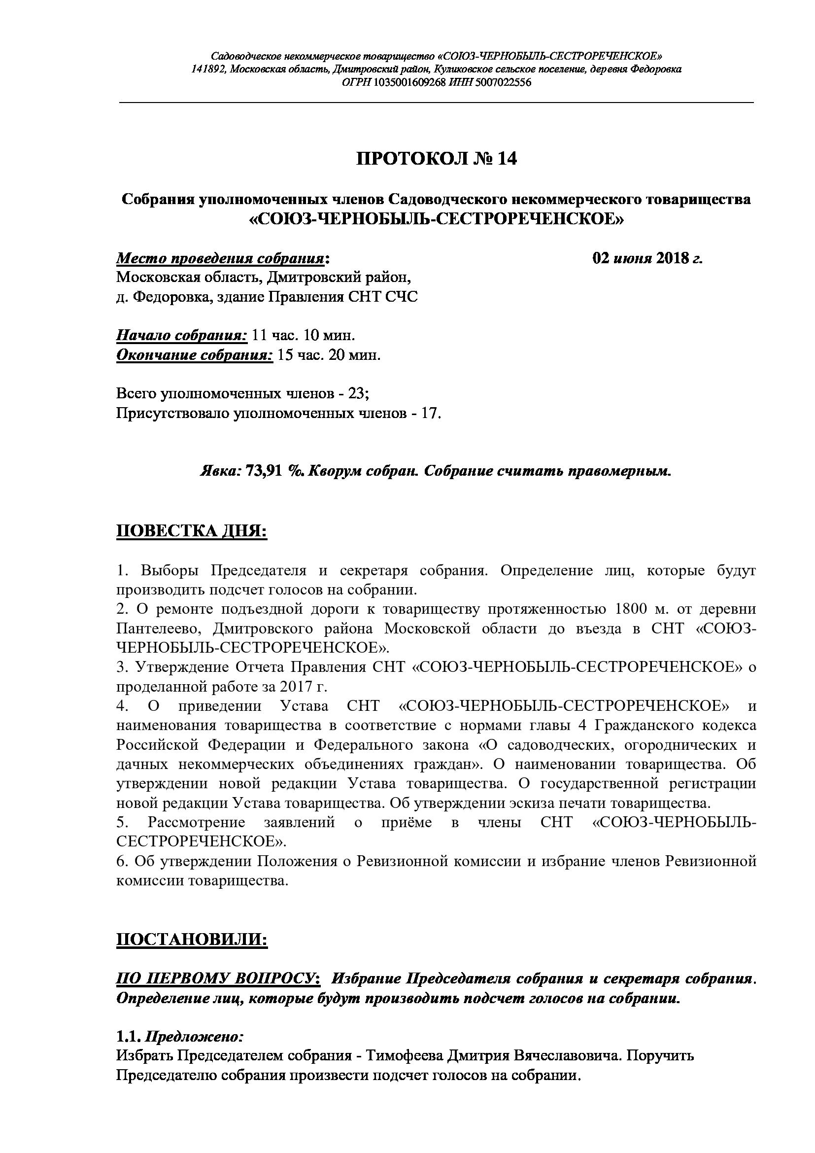 Протокол № 14 собрания уполномоченных членов СНТ "СОЮЗ-ЧЕРНОБЫЛЬ-СЕСТРОРЕЧЕНСКОЕ" от 02.06.2018 г.