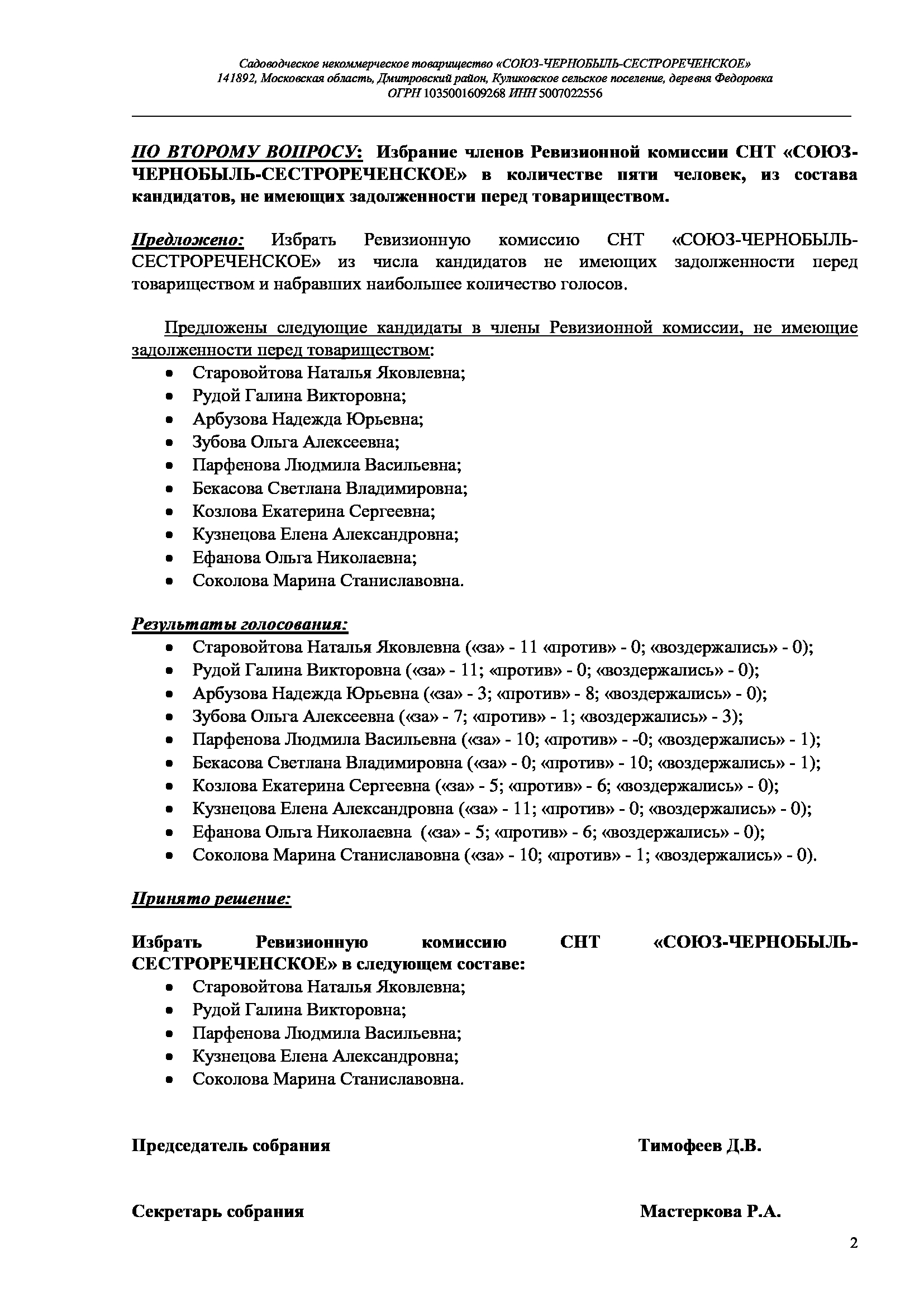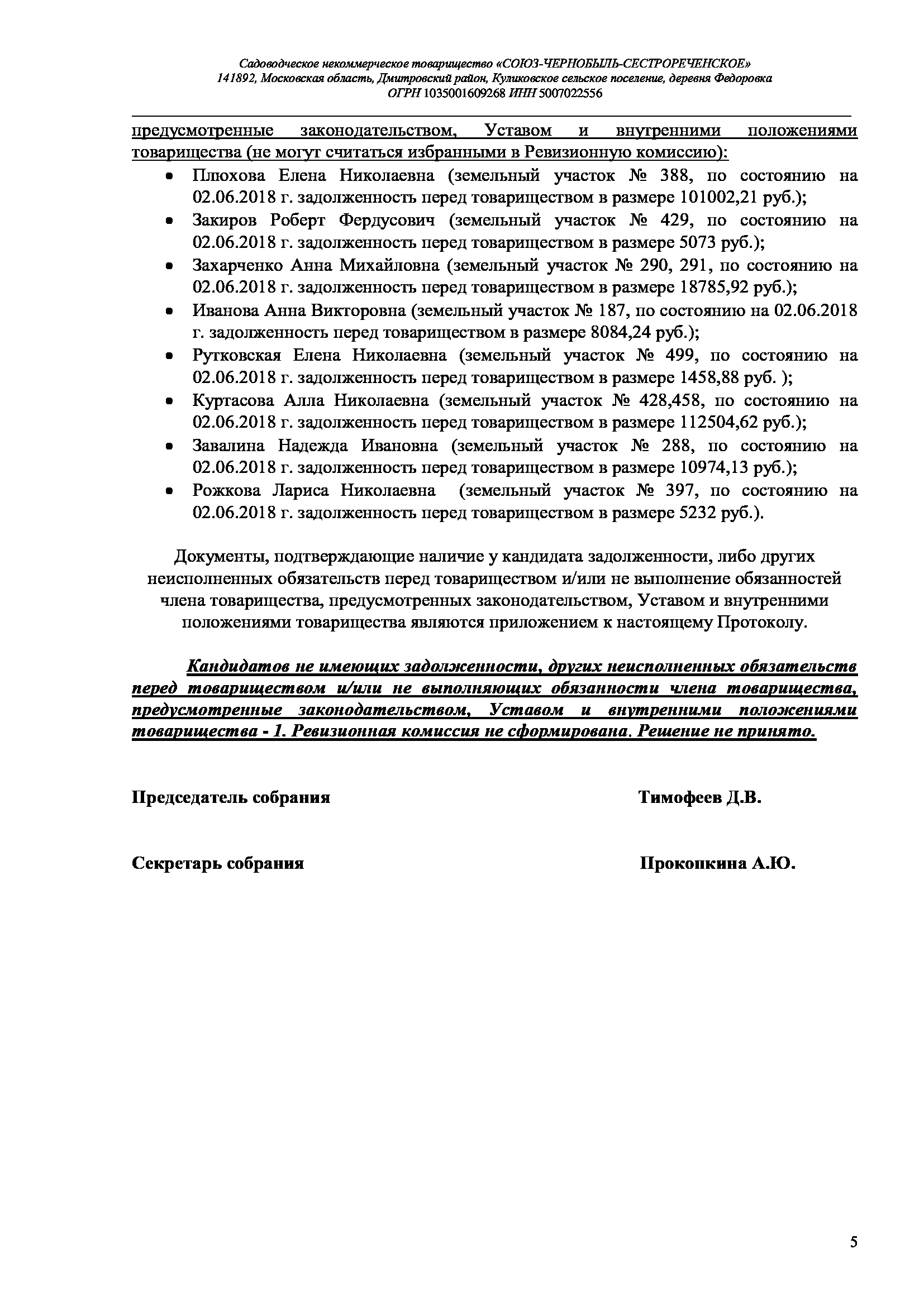 Протокол № 15 собрания уполномоченных членов СНТ "СОЮЗ-ЧЕРНОБЫЛЬ-СЕСТРОРЕЧЕНСКОЕ" от 30.06.2018 г.:
