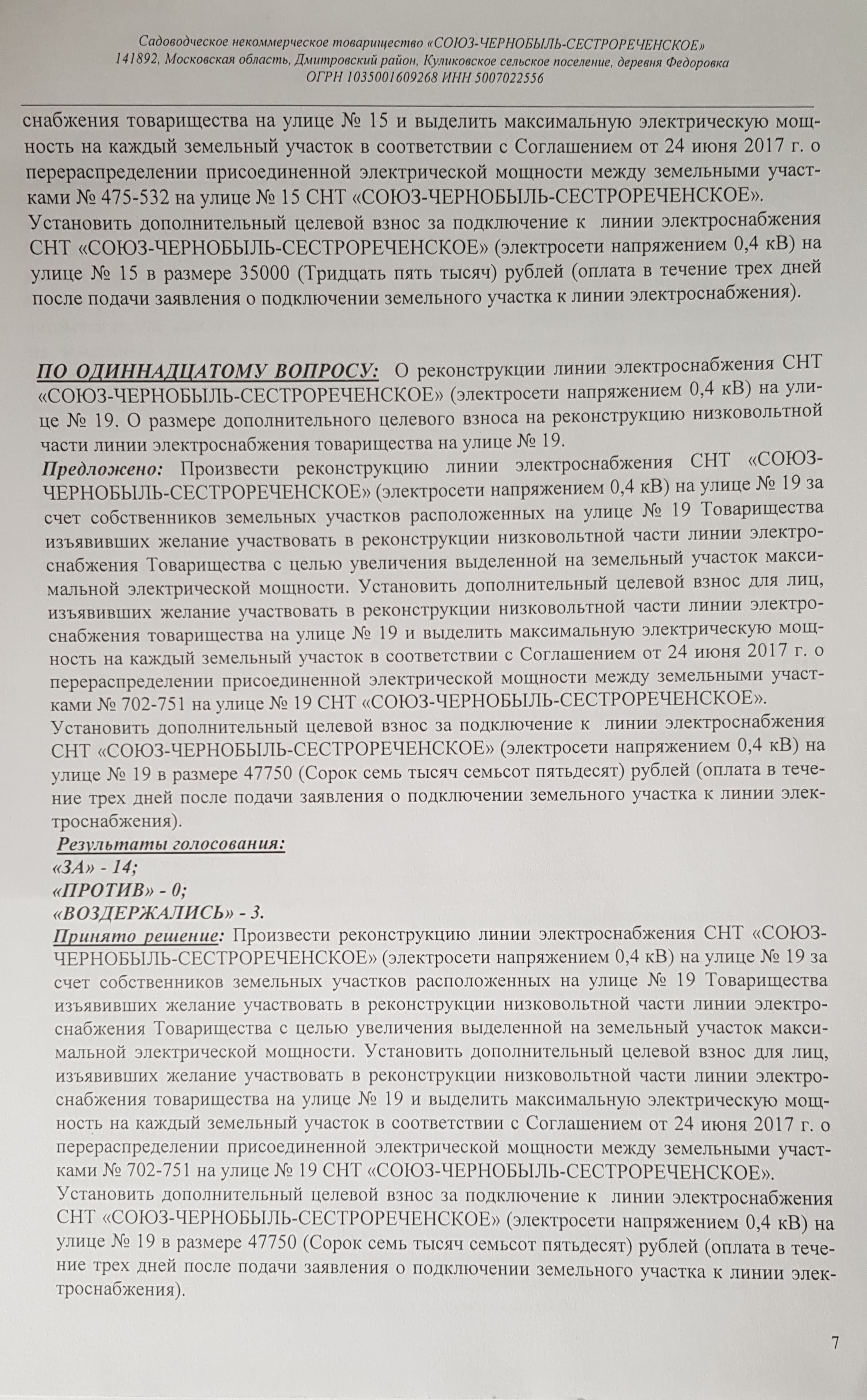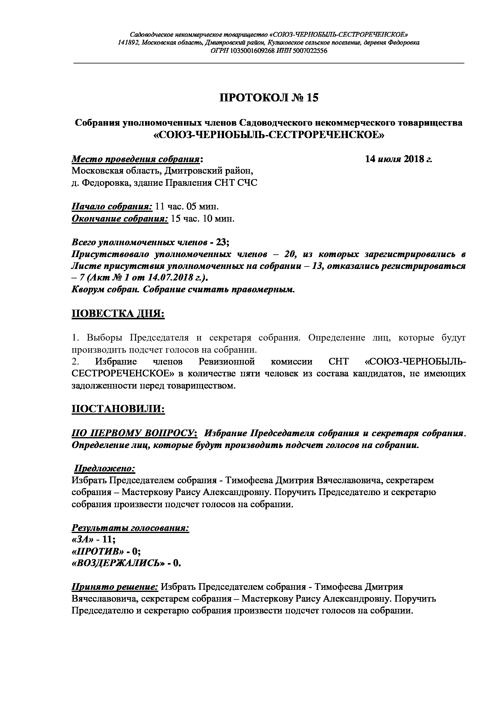 Протокол № 15 собрания уполномоченных членов СНТ "СОЮЗ-ЧЕРНОБЫЛЬ-СЕСТРОРЕЧЕНСКОЕ" от 14.07.2018 г.:
