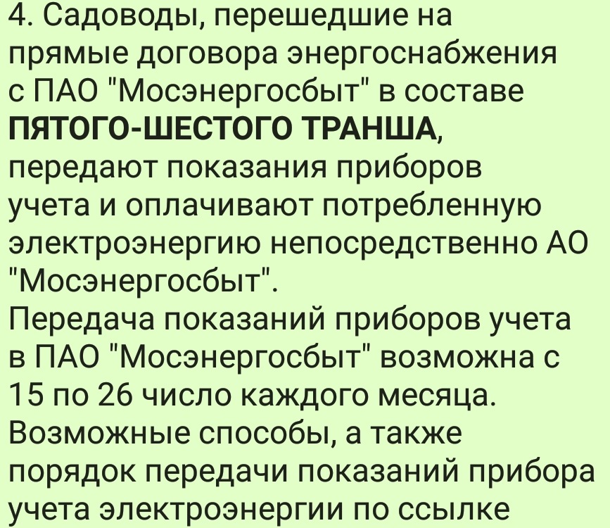 Информация для садоводов перешедших на прямые договора энергоснабжения с ПАО "Мосэнергосбыт" и имеющих лицевые счета: