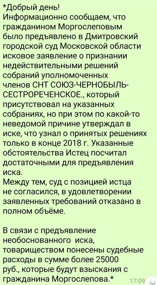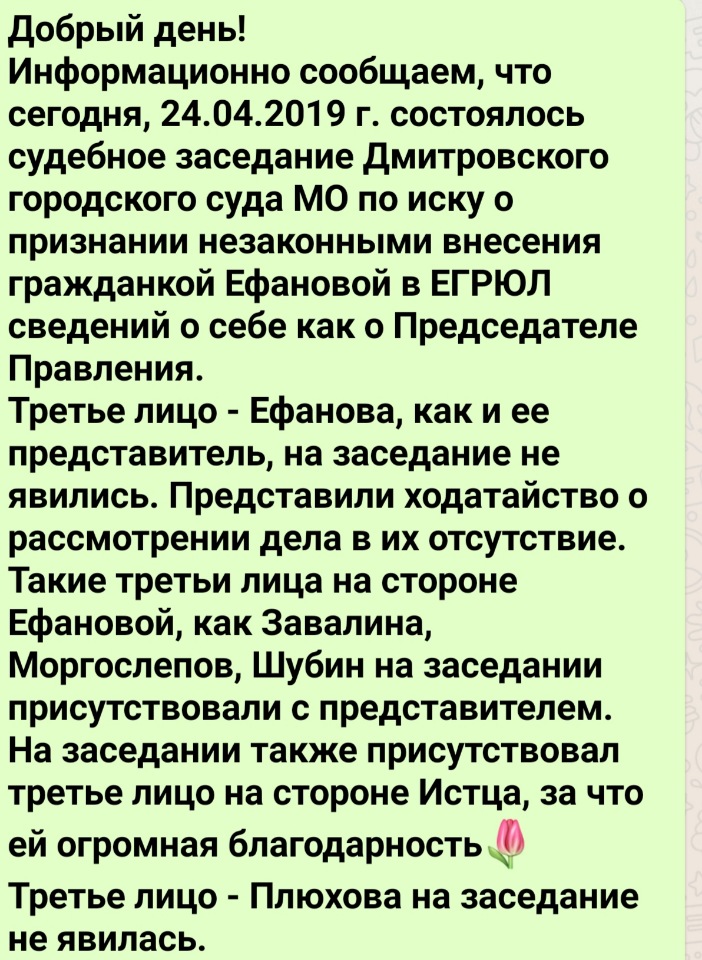 Информационно сообщаю, что 22 мая 2019 г. в Дмитровском городском суде МО состоялось очередное судебное заседание по иску о признании незаконными действий гражданки Ефановой по внесению в ЕГРЮЛ недостоверных сведений о себе как о Председателе Правления СНТ СОЮЗ-ЧЕРНОБЫЛЬ-СЕСТРОРЕЧЕНСКОЕ и признании недействительным соответствующего протокола от 07.12.2019 г.