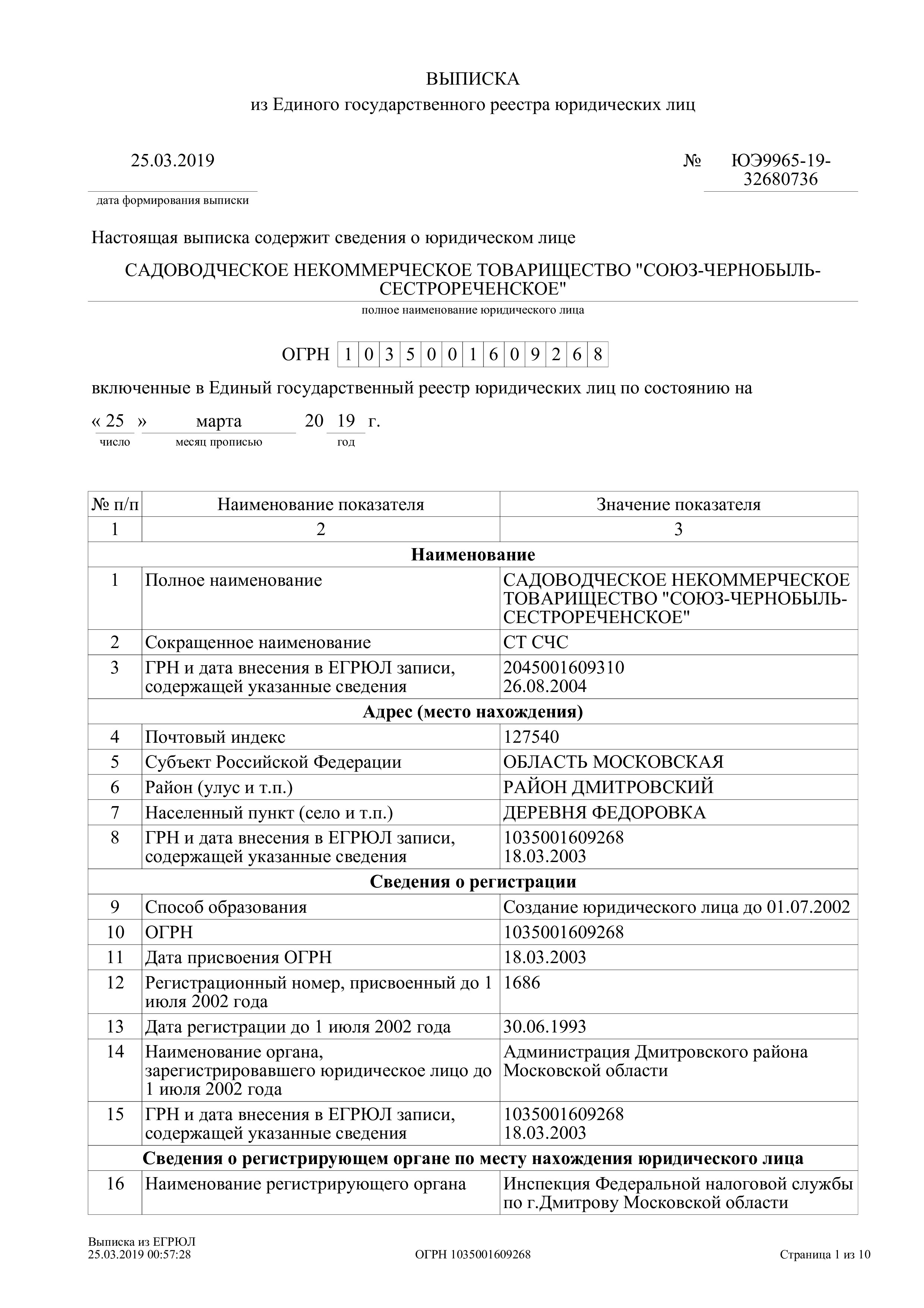 Вся информация о изменениях в отношении юридических лиц является общедоступной и содержится в федеральном информационном ресурсе - Единый государственный реестр юридических лиц (ЕГРЮЛ). Как следует из прилагаемой Выписки из Единого государственного реестра юридических лиц от 25.03.2019 г., № ЮЭ9965-19-32680736 Председателем Правления СНТ "СОЮЗ-ЧЕРНОБЫЛЬ-СЕСТРОРЕЧЕНСКОЕ" является Тимофеев Д.В.