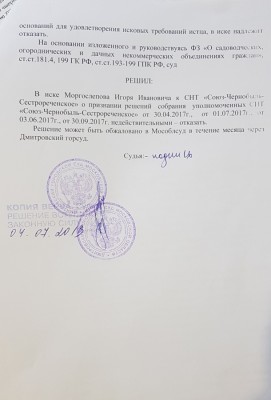 Дмитровским городским судом Московской области подтверждены полномочия легитимного Правления СНТ "СОЮЗ-ЧЕРНОБЫЛЬ-СЕСТРОРЕЧЕНСКОЕ" в составе: