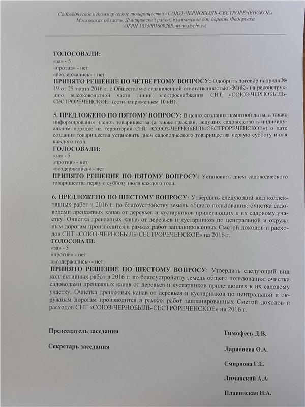 Протокол № 2 заседания Правления СНТ "СОЮЗ-ЧЕРНОБЫЛЬ-СЕСТРОРЕЧЕНСКОЕ" от 05 апреля 2016 г. (дата размещения: 11 апреля 2016 г.)