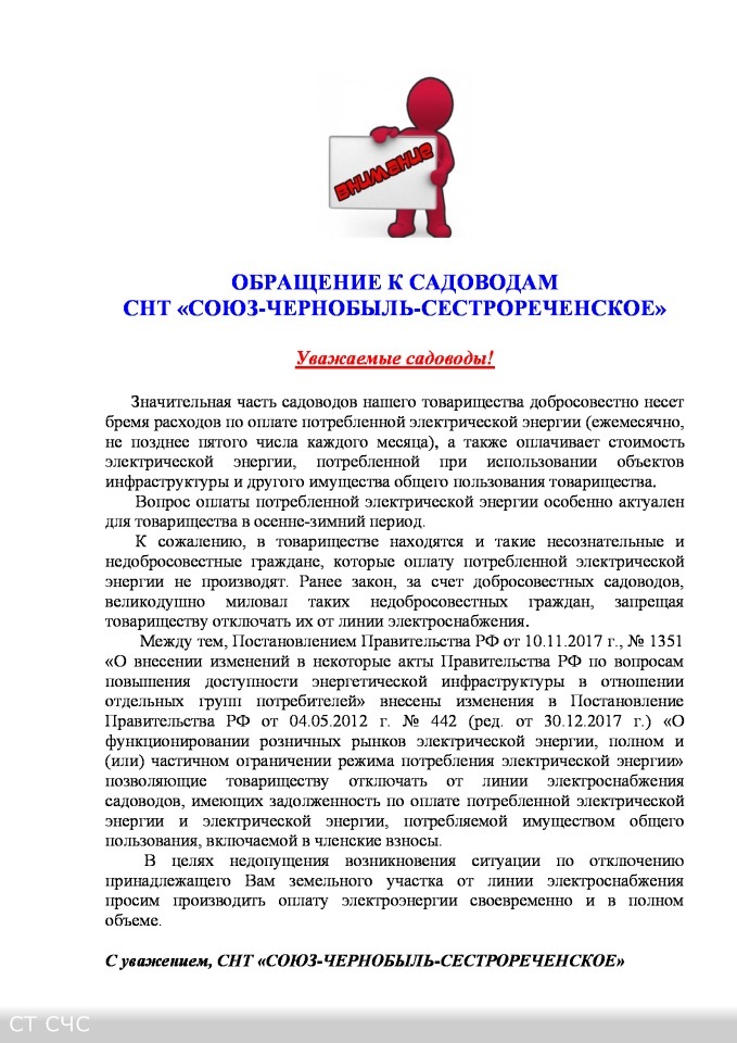 ОБРАЩЕНИЕ К САДОВОДАМ: отключение электрической энергии