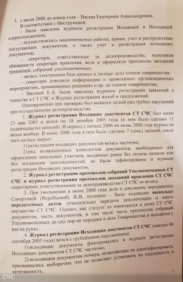 Описание: Проверка производилась в период с 22.03.2009 г. по 26.04.2009 г. Ревизионной комиссией товарищества в составе: Председатель Ревизионной комиссии – Куртасова А.Н., член РК – Кудрявцева Н.А. Выписка из Заключения Ревизионной комиссии никем не подписана, заверена только Председателем Хапаловым Е.А. Самого Заключения, как такового, нет. Проверялось только делопроизводство и ведение документации, проверка финансово-хозяйственной деятельности не проводилась. В Выписке из Заключения указано, что проверка проведена соответствии с Положением о Ревизионной комиссии, однако такое положение никем не утверждалось.