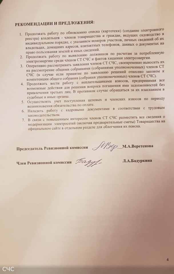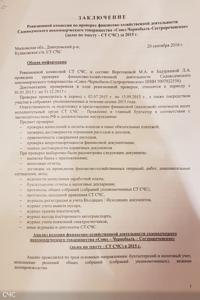 Описание: Проверка финансово-хозяйственной деятельности производилась Ревизионной комиссией товарищества в составе: Веретеновой М.А. и Бадуркиной Л.А. Ревизия не выявила финансовых злоупотреблений или нарушений. Заключение Ревизионной комиссии утверждено Протоколом № 8 общего собрания (собрания уполномоченных) членов СНТ "СОЮЗ-ЧЕРНОБЫЛЬ-СЕСТРОРЕЧЕНСКОЕ" от 01.10.2016 г.