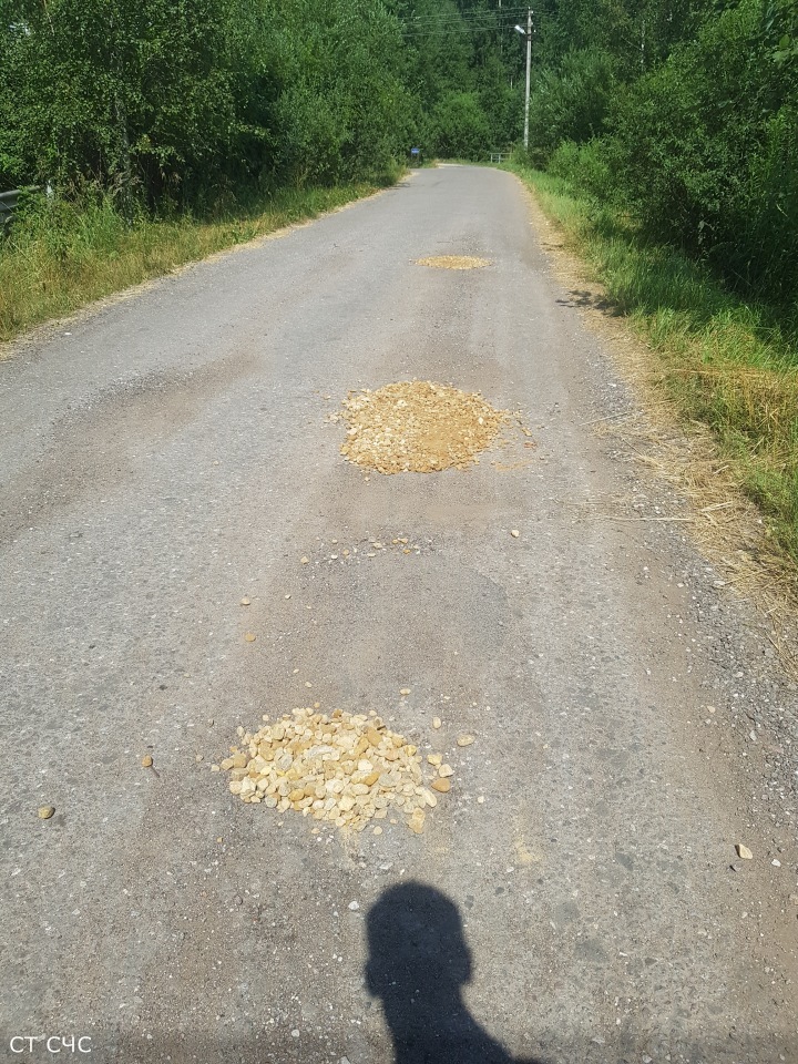 Произведена засыпка гравием провала под дорогой на въезде в товарищество :