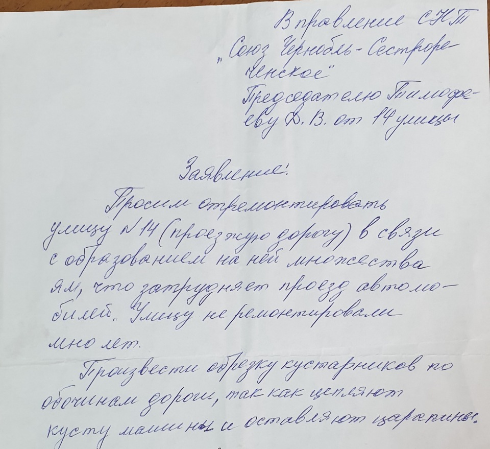С уважением, Председатель СНТ "СОЮЗ-ЧЕРНОБЫЛЬ-СЕСТРОРЕЧЕНСКОЕ"