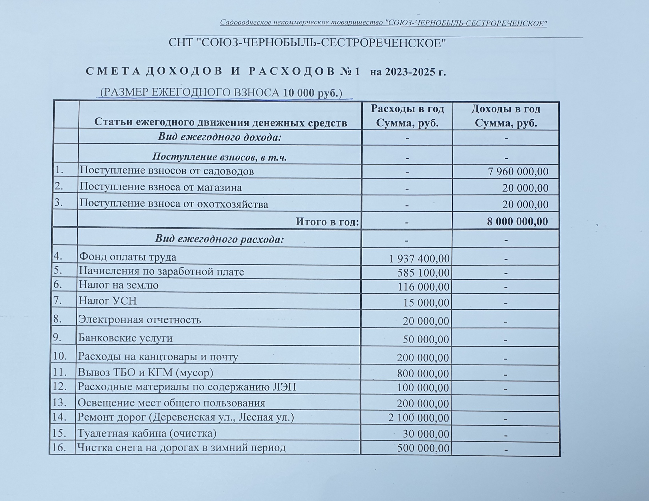 - Смета доходов и расходов СНТ "СОЮЗ-ЧЕРНОБЫЛЬ-СЕСТРОРЕЧЕНСКОЕ" № 1 на 2023-2025 г.г. (РАЗМЕР ЕЖЕГОДНОГО ВЗНОСА 10 000 руб.);