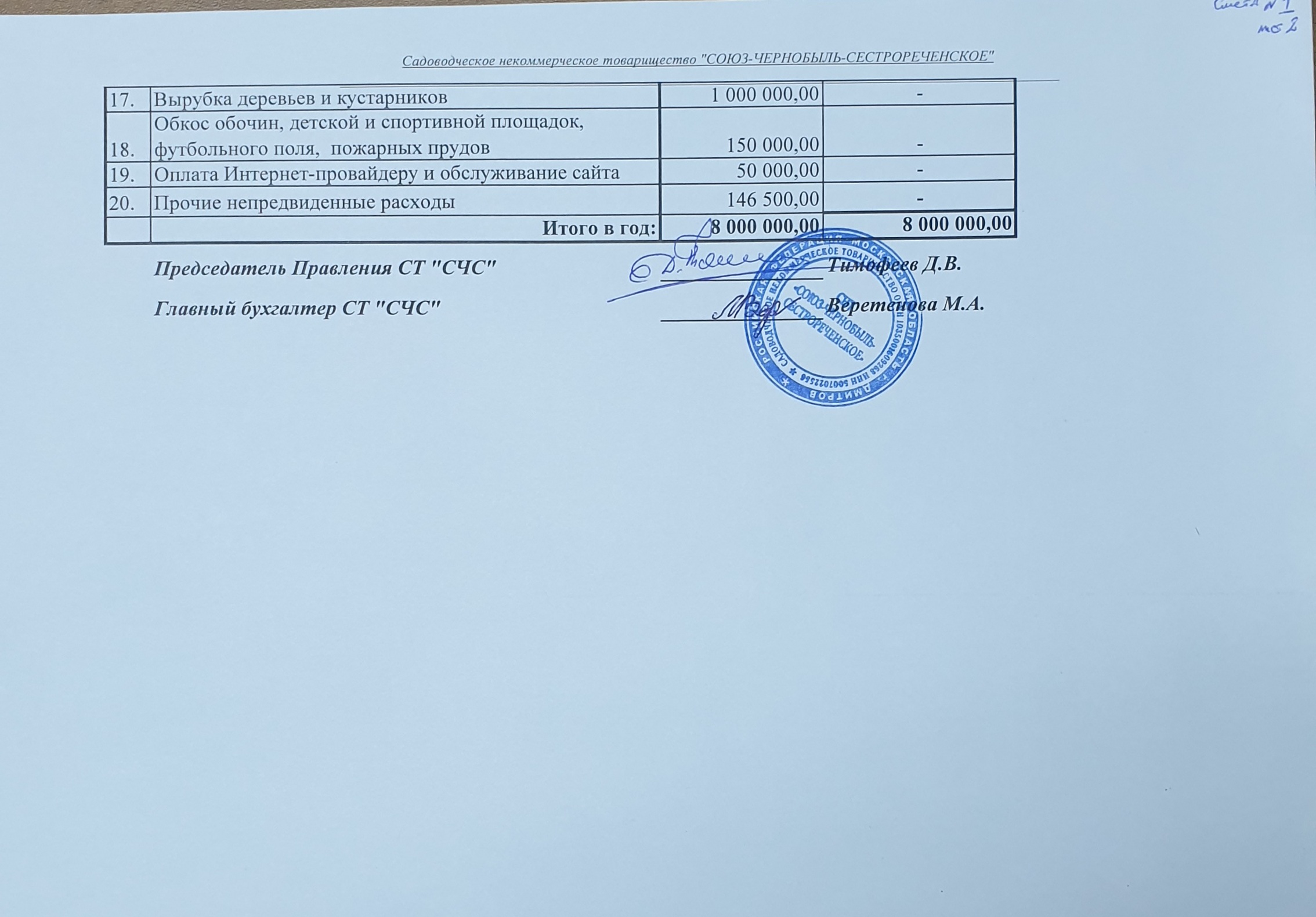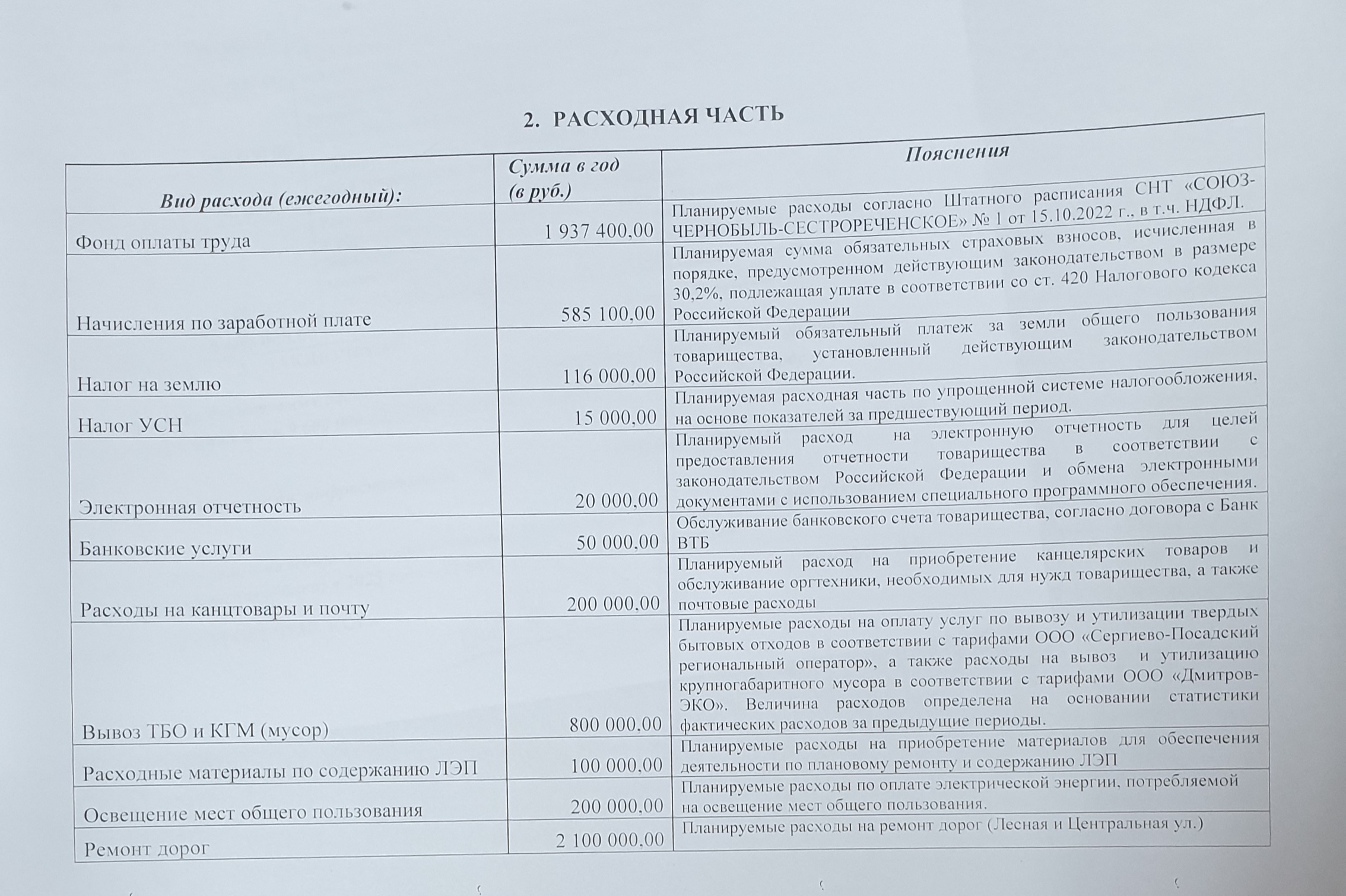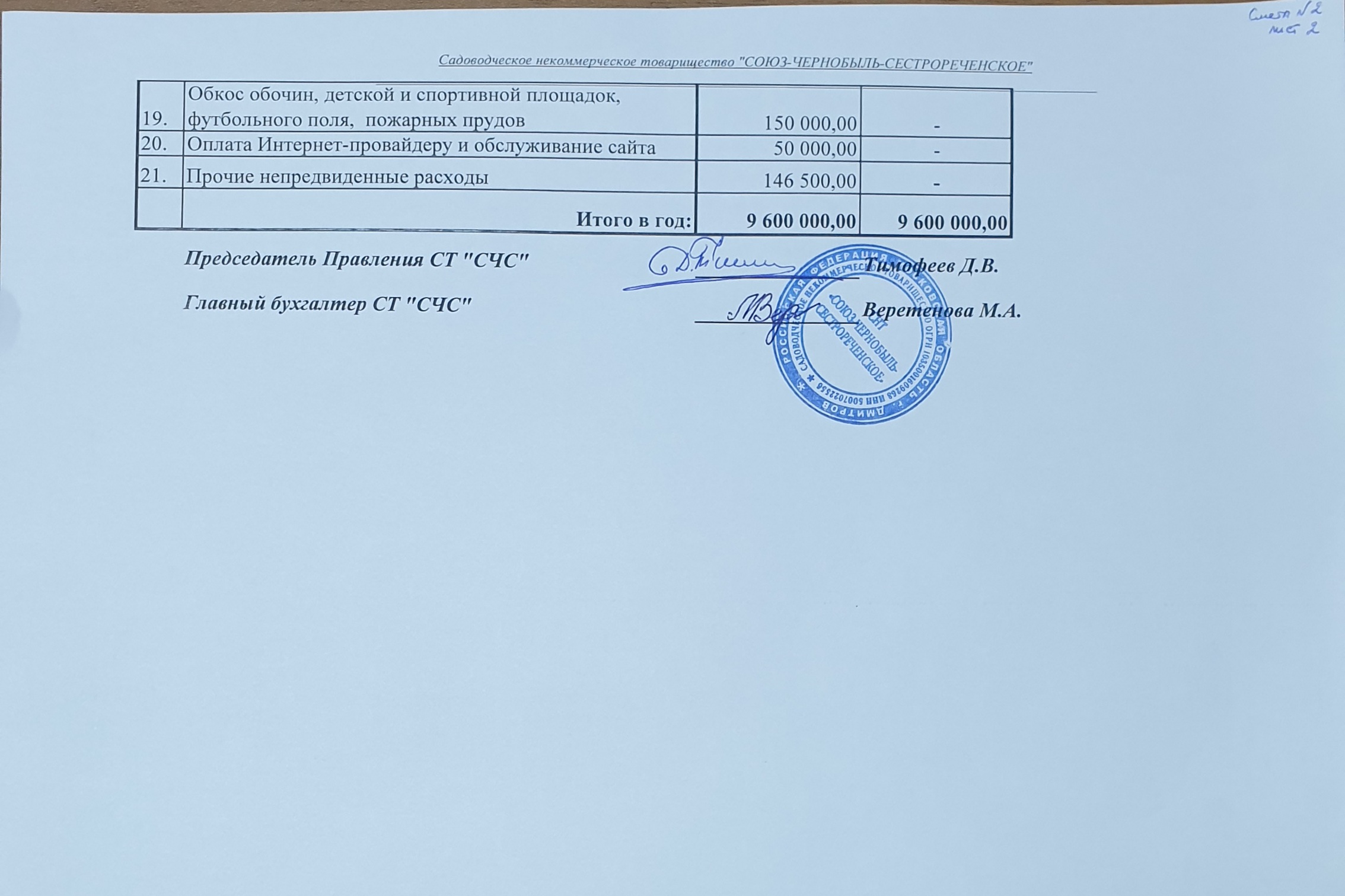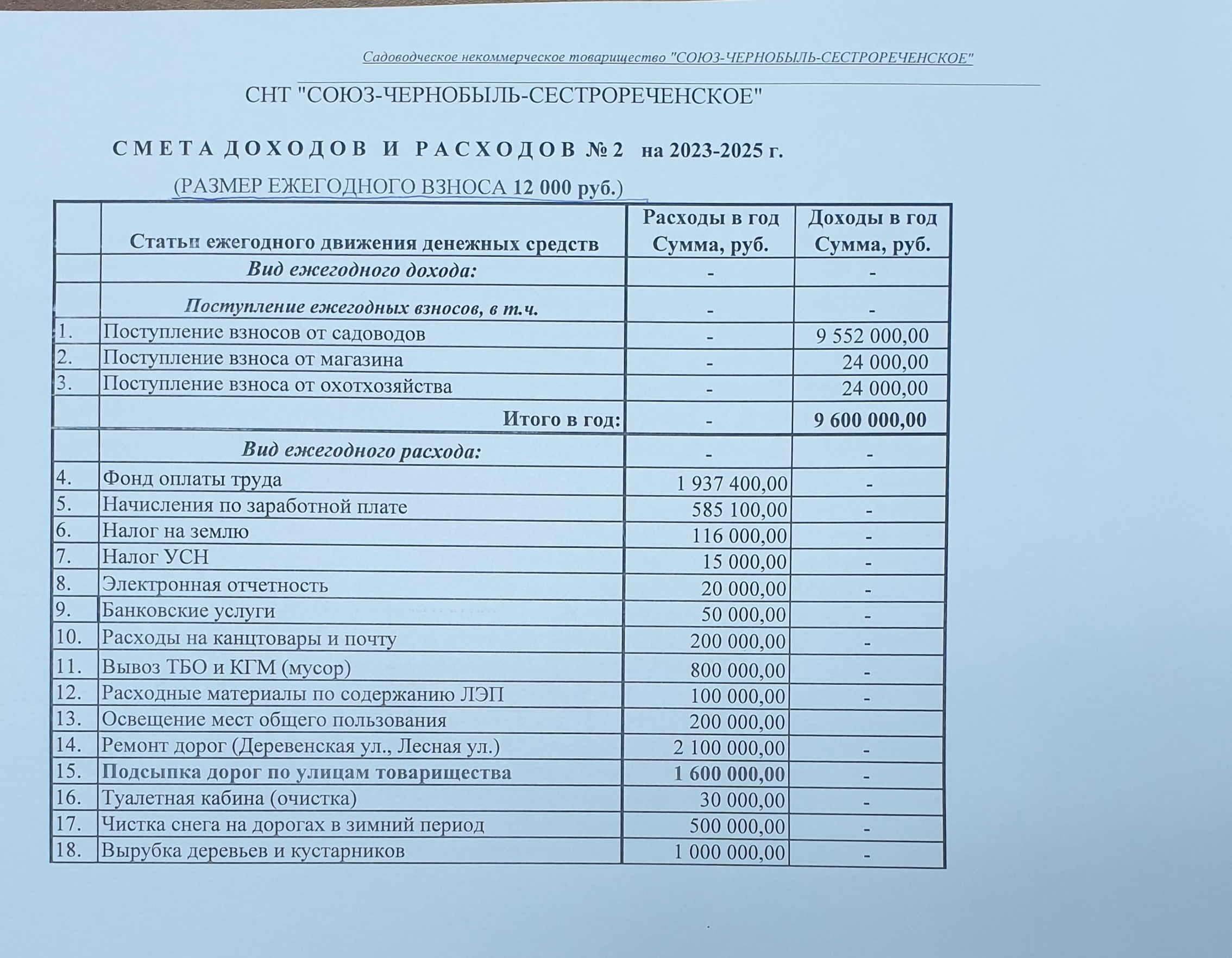 - Смета доходов и расходов СНТ "СОЮЗ-ЧЕРНОБЫЛЬ-СЕСТРОРЕЧЕНСКОЕ" № 2 на 2023-2025 г.г. (РАЗМЕР ЕЖЕГОДНОГО ВЗНОСА 12 000 руб.).